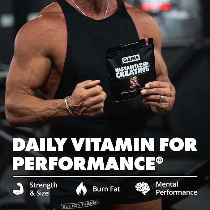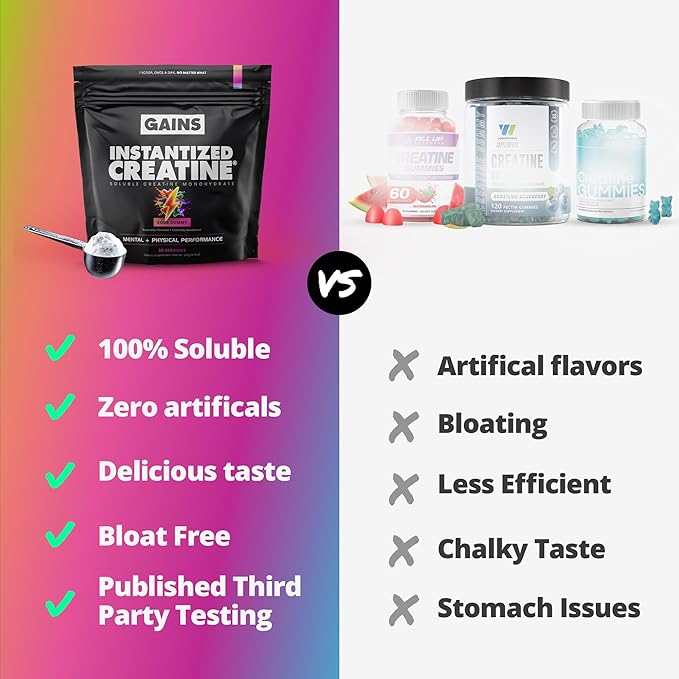 - INSTANTIZED CREATINE: Gains in Bulk Instantized Creatine is a 100% soluble creatine monohydrate powder, delivering all the benefits of creatine without the bloating, water retention, or gritty texture. Backed by research, it helps enhance muscle endurance, strength, and size for peak performance.