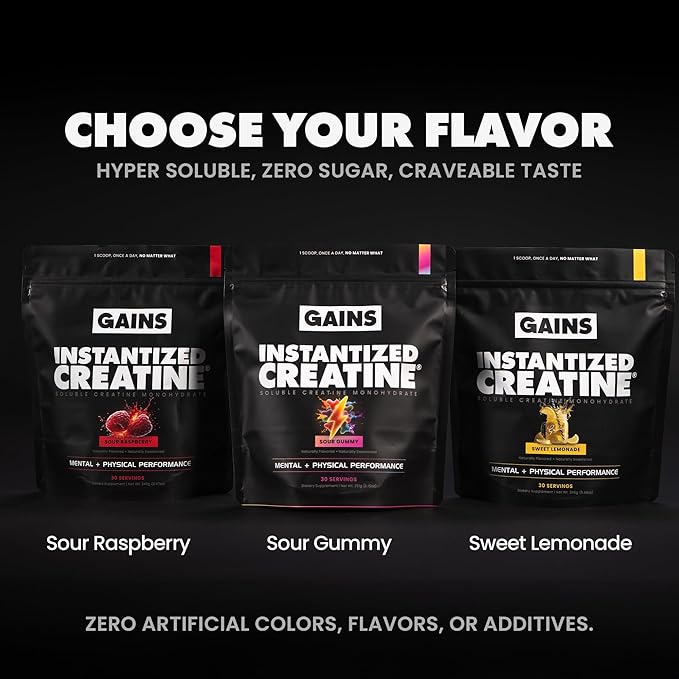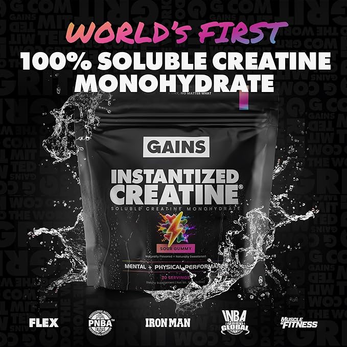 Gains in Bulk Instantized Creatine Monohydrate for Women and Men, Soluble Pre Workout Powder, Supports Muscle Building, Strength and Performance, Bodybuilding Supplements, Sour Gummy, 30 Servings