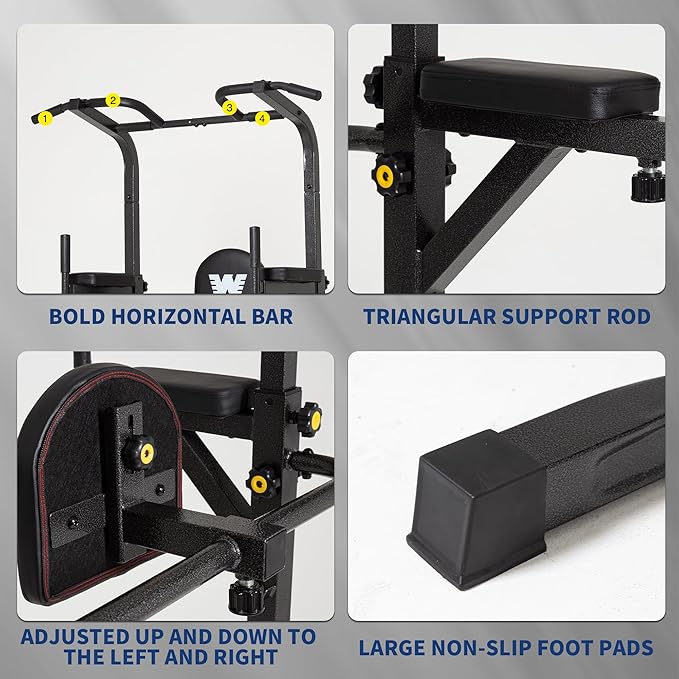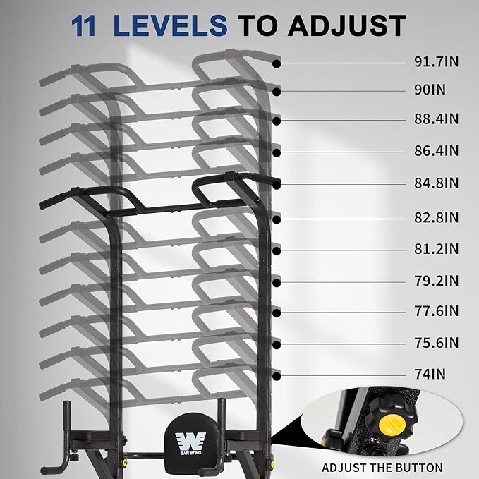 - 【11-Level Height-Adjustable Power Tower】The pull up dip station features 11 height adjustments from 74" to 91.7", allowing it to accommodate users of various sizes. The 3D ergonomic backrest moves up, down, left, and right to perfectly match your body’s curves, providing targeted lower back support during exercise. Suitable for strength training, muscle toning, and core stability, it serves as a practical all-in-one solution for shared family fitness.