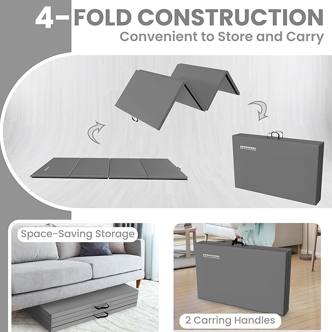 - Effortless Portability: Transform any space instantly! This exercise mat folds into a compact 48” x 30” x 8” size with 4-panel design, making storage in closets, cars, or under beds a breeze. Unfold to a spacious 4’ x 10’ training area—ideal for yoga flows, Pilates routines, or group workouts