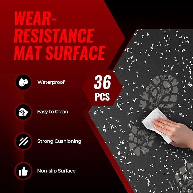 - 【All Places Usable】36 tiles, each with a thickness of 0.79 inch and a size of 24in x 24in, covers 144 Sq Ft. You can place this flooring mat wherever you need it! It's suitable for a garage, gym, family fitness room or playroom