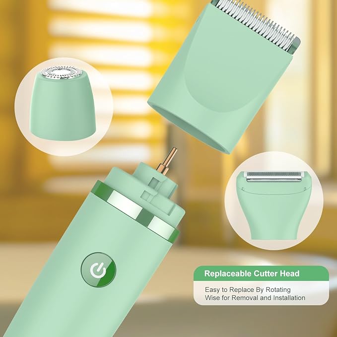 - 3-in-1 Bikini Trimmer: This women’s bikini trimmer comes with three highly efficient shaving heads, expertly designed to remove hair on whole body areas. One is body trimmer head, ideal for use on the arms, legs, and other parts of the body. One is detail trimmer head is for precise bikini detailing, and the facial trimmer head for a painless on on the cheeks, chins, and upper lips, providing a comprehensive grooming solution in one compact device