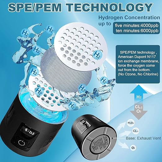 - 【High Hydrogen Concentration & Pure Water】Adopting advanced SPE + PEM electrolysis tech, this hydrogen water bottle produces up to 6000ppb hydrogen in 10 minutes. The bottom vent safely expels harmful byproducts such as chlorine, ozone, and hydrogen peroxide, ensuring only pure and healthy hydrogen-enriched water for daily use.