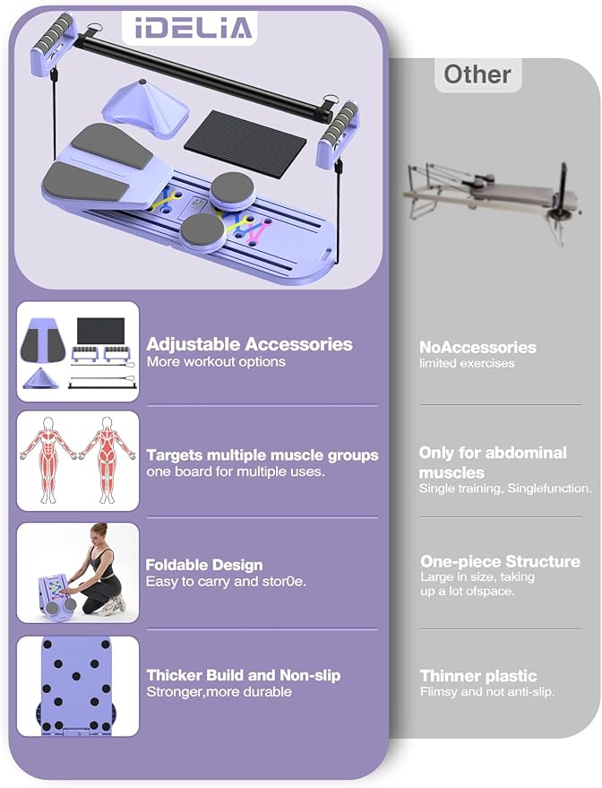 - 【Foldable Pilates Board for Small Spaces】 Compact enough to tuck under beds, in closets, or in car trunks, this portable pilates reformer works well in studio apartments, offices, and during travel. Its space-saving design means you won’t have to clutter your space with bulky fitness equipment anymore.