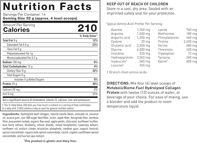 MetabolicBiome™ Fuel Hydrolyzed Collagen Protein, Vanilla - High-Performance Daily Shake, 20g Clean Protein, 9g Non-grain Fiber, 9g Healthy Fats, Microbiome Support, Allergen-free, 14 Servings