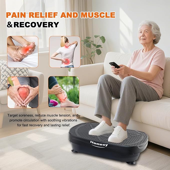- 【BUILD YOUR DREAM BODY】Homesy vibration plate exercise machine can activate your body's potential. With a powerful motor of up to 200W, you can easily achieve your ideal body shape. High-frequency vibration technology stimulates deep muscle activity and promotes increased contractions, effectively burning calories and fat. This exercise is more efficient than traditional equipment that relies on resistance or gravity.