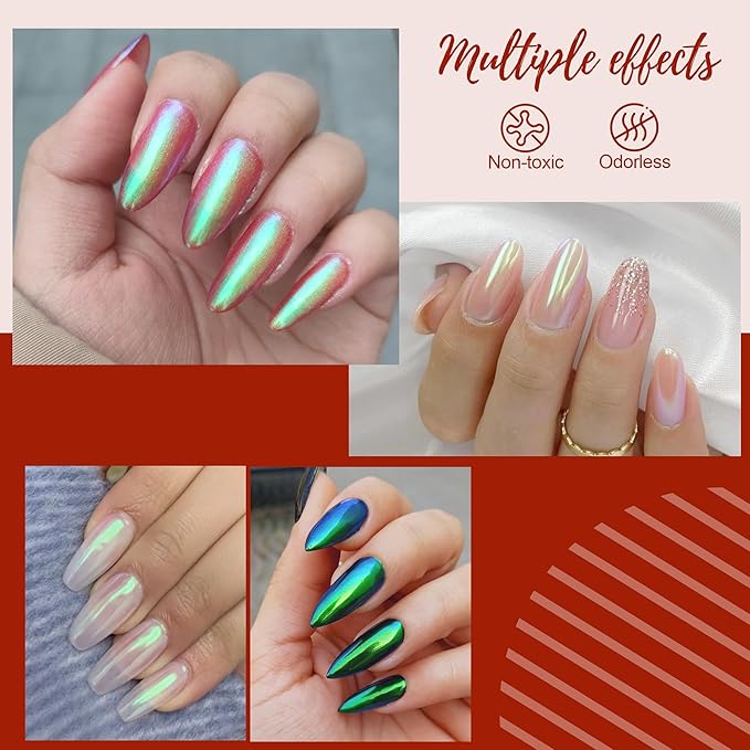 - 【PACKAGE CONTENTS】:1 PCS red aurora chrome nail pearl pigment powders. It needs to be used with gel nail polish and no wipe top coat. They can make many different design for your gel nail polish. It gives different color base a pearly shine for your nails
