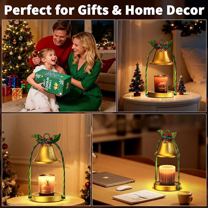 - Festive Christmas Bell Design Features an elegant bell-shaped shade with gold base and green accents, creating a perfect holiday ambiance. This decorative candle warmer adds cheerful Christmas charm to any room while safely melting your favorite scented candles.