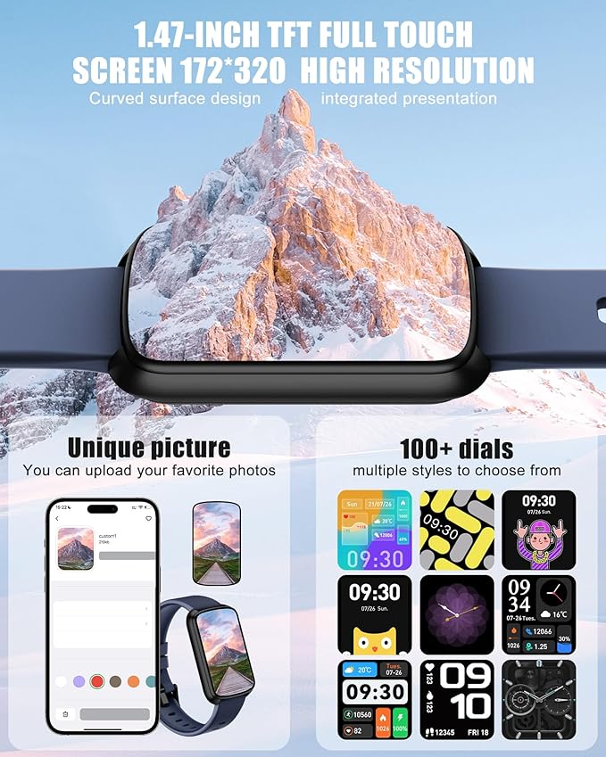 - 【1.47" Touchscreen & 200+ Dials】Enjoy a crystal-clear 1.47-inch TFT display with brilliant clarity and responsive touch control. The GloryFit app offers over 200 stylish watch faces, plus the option to upload your own photo for a personalized look. This feature-rich display seamlessly combines advanced functionality with custom style, elevating your smart watch experience.