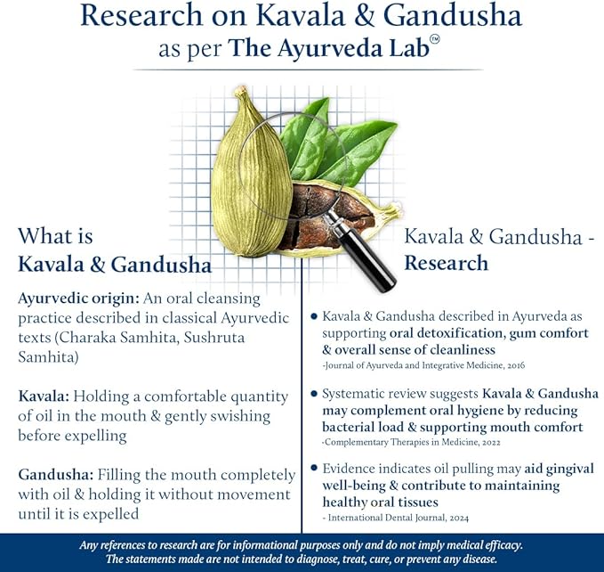 - Perfect for Kavala & Gandusha: For Kavala, swish 1 tbsp for 5–15 min of oil through teeth & gums before brushing. For Gandusha, keep 1-2 tbsp in mouth for 5-15min.