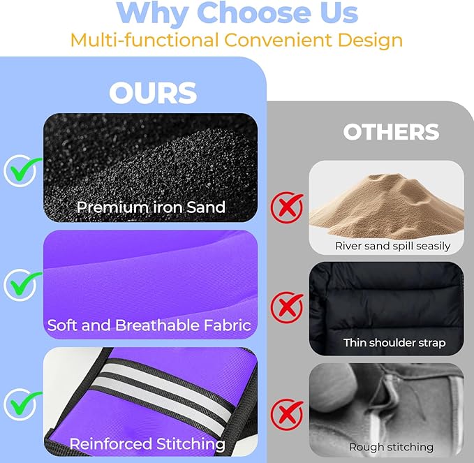 - PREMIUM MATERIAL - Our strength training weight vests durable neoprene fabric and iron sand weights, as well as a stronger double-stitched design, promising longevity while maintaining its shape and effectiveness over time.