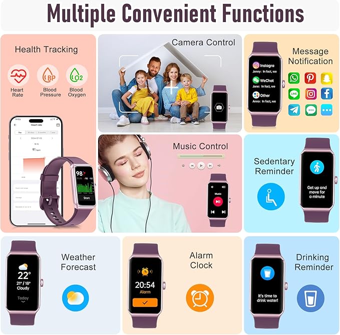 - Multiple Convenient Functions :This smart band has multiple functions such as remote photography, mobile search, drinking water reminder, sedentary reminder, menstrual reminder cycle, real-time weather display, etc