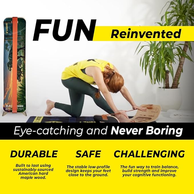 - SAFETY-FIRST DESIGN FOR ALL GENERATIONS: Experience the joy of fitness with our user-friendly wooden balance board and stand. Designed with a stable, low-profile and innovative slackline system, the wobble board for kids & adults lets you remain close to the ground, reducing risk. Unlike other balance trainers, this balance board trainer isn't made of metal or moving parts, making it much safer. This snowboard balance board for kids & adults is a great addition to your at home workout equipment.
