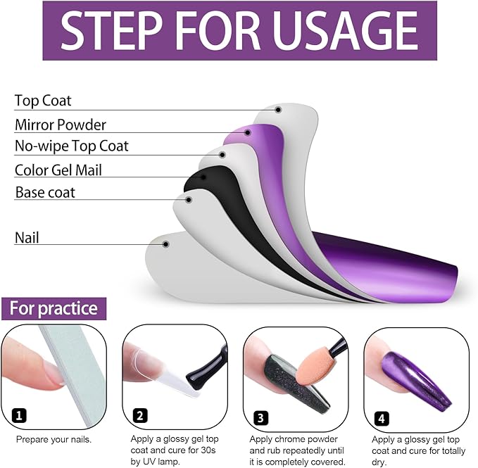 - 【The Scope Of Application】All chrome powders should only be applied to glossy No wipe top coat to embellish Nail-Polishes color. Otherwise it is unusable, it can't be applied directly to the nail, and it can't be applied directly to the skin. Artdone chrome powder can be applied on UV gel nails, acrylic nails or false nail tips. You can use them very easily
