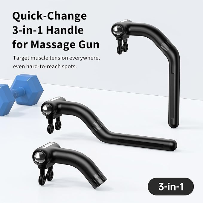 - 【3-in-1 Detachable Handle for Full Reach】 Reach every muscle easily with the 3-in-1 detachable handle. Designed for a secure grip and extended access, this massage gun with extension handle allows you to comfortably massage your neck, upper back, shoulders, and other hard-to-reach areas on your own