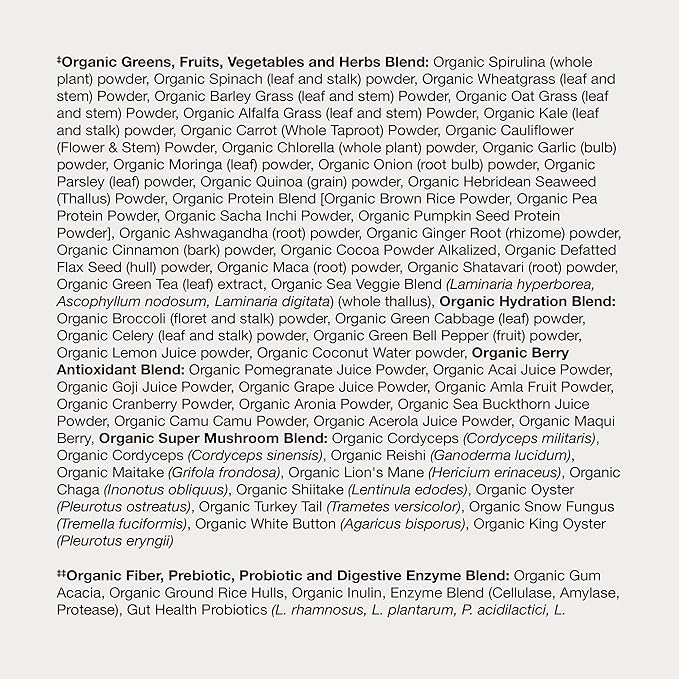 - Organic Supergreens Powder: Each serving has 7g and 70+ types of superfoods and 3g of fiber to support overall wellness. Our blend also has organic greens, fruits, vegetables, herbs, super mushrooms, and prebiotics/probiotics with digestive enzymes