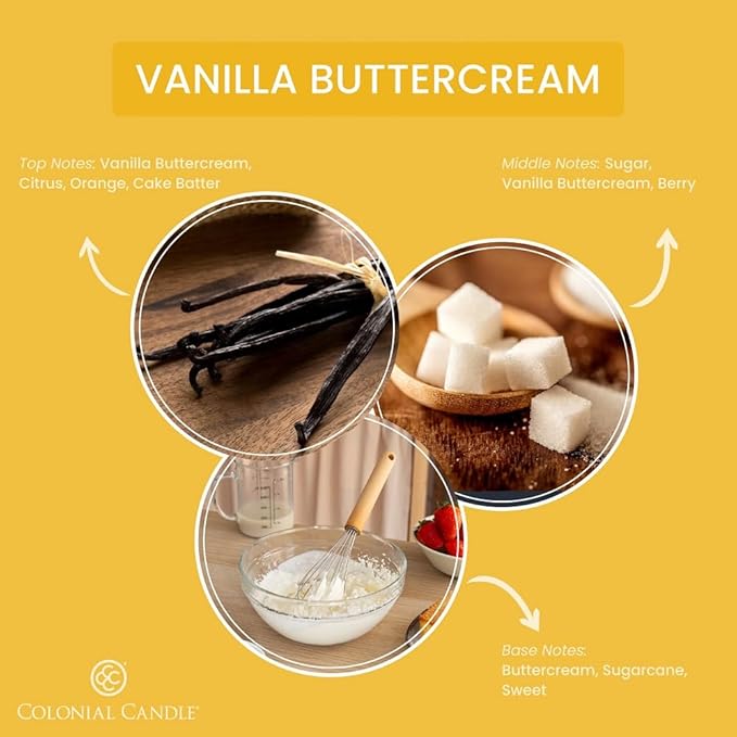 - VANILLA BUTTERCREAM: Vanilla Buttercream is the sweetest vanilla bean icing finished with a touch of citrus zest for a zing! Featuring our premium fragrance load for a superior fragrance experience.