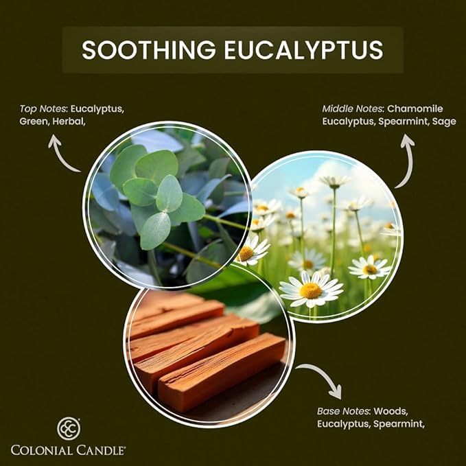 - SOOTHING EUCALYPTUS: The Soothing Eucalyptus candle offers an uplifting, therapeutic aroma of eucalyptus, blending fresh, cleansing, and relaxing scents. This sweet yet zesty fragrance brings harmony, tranquility, and spa-like serenity to any room, restoring energy and promoting a peaceful atmosphere.