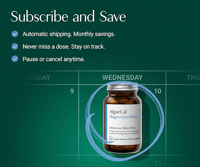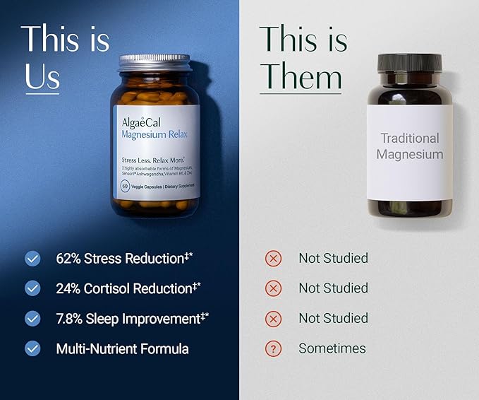 AlgaeCal Magnesium Relax™ - Chelated Magnesium with Ashwagandha for Sleep & Occasional Anxiety - Glycinate, Malate, Citrate - Sleep, Mood, & Cortisol Support (120 Caps - 2 Months Supply)