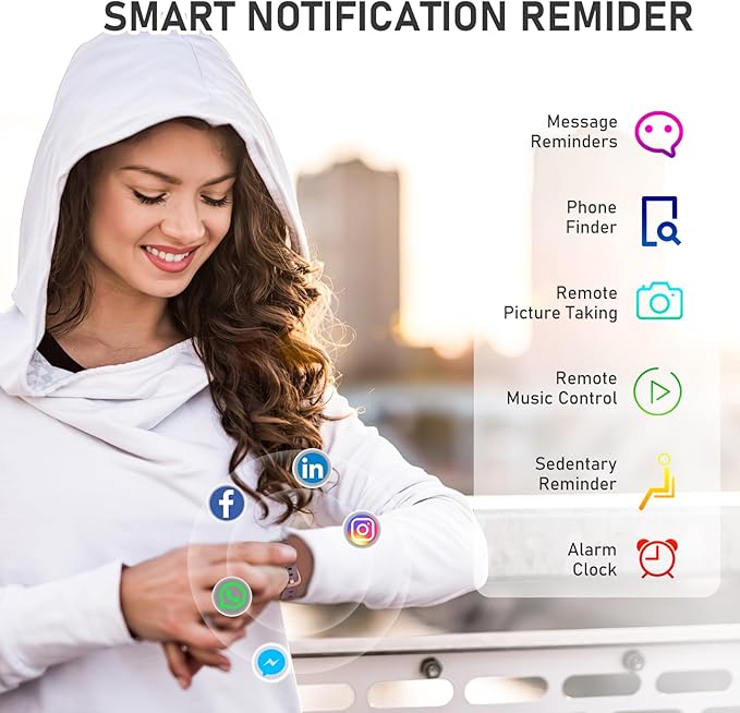 - 【Smart Notification Remider】 With Bluetooth connection to your phone, it can support incoming calls/text alerts/APP message notifications (WhatsApp/Facebook/Instagram etc.), you will never miss your important messages. With the fitness watch, you can also perform sedentary reminder, water reminder, alarm clock, stopwatch, remote control photo, find devices, etc. to make your life healthier and smarter.