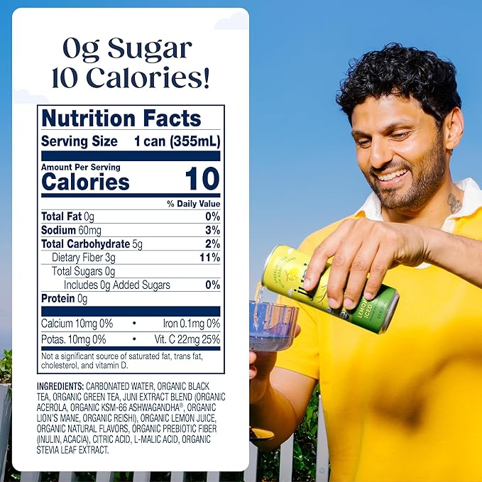Juni Sparkling Adaptogen Drink with Ashwagandha, Lion’s Mane & Reishi Mushrooms | Green Tea for Focus, Zero Sugar, 10 Calories, Organic | Non Alcoholic Drinks - Lemonade Iced Tea 12 pack