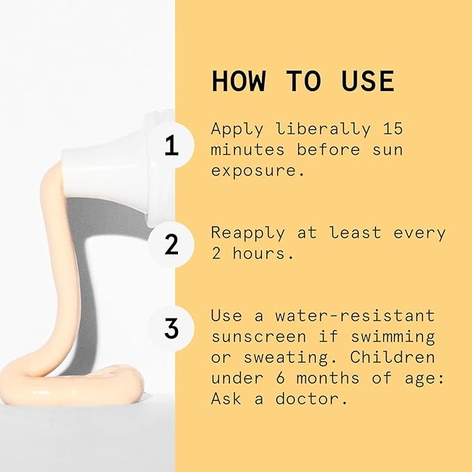 - How To Use: Apply liberally 15 minutes before sun exposure. Reapply at least every 2 hours. Use a water-resistant sunscreen if swimming or sweating. Children under 6 months of age: Ask a doctor. Suitable For: All skin types.