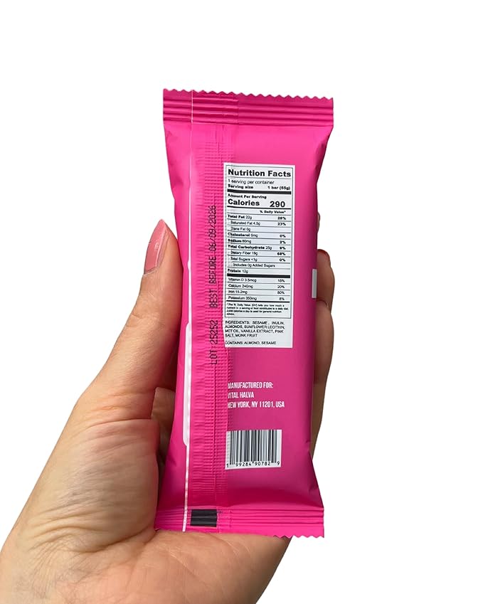 Vital Halva Fiber Protein Sesame Bar, Gluten Free, 19g Fiber, 12g Protein, 6 Net Carbs (10 Bars, 65g each) Zero Added Sugar, Flavor Pink Salt