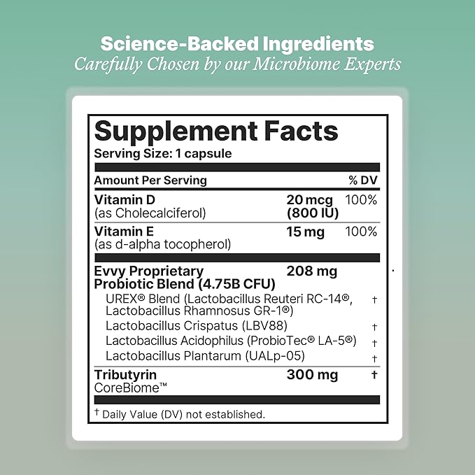 - EVVY WOMEN'S COMPLETE PROBIOTIC. Advanced daily 3-in-1 probiotic for gut, urinary tract, & vaginal health — backed by science and uniquely formulated for women. Includes vaginal probiotic strains to support pH balance and feminine care.