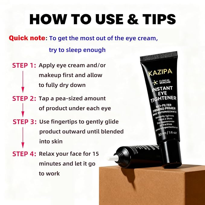 - How to Use:Apply a small amount (a few drops, roughly pea-sized) to clean periocular skin morning and night, before using oils, moisturizers, or heavier creams. For first-time use: Conduct a patch test by applying 1-2 drops behind your ear. If no irritation occurs within 24 hours, it’s safe to use on your under-eye area. Gently pat into skin (avoid pulling) until fully absorbed for best results.