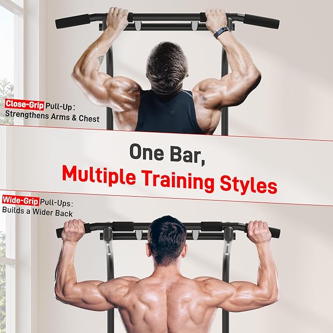 - 【Adjustable Height】This pull-up bar is made of high-quality alloy steel pipe, ensuring exceptional durability and sturdiness. It offers two exercise styles for pull-ups, allowing you to freely choose between close-grip and wide-grip pull-ups. This freestanding pull-up bar tower features 11 adjustable height settings, with the lowest setting specially designed for children, making it perfect for the whole family. Additionally, it includes 5 adjustable push-up bar height levels, suitable for workouts for all family members.