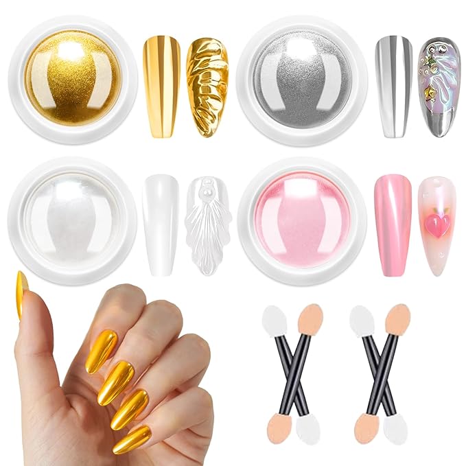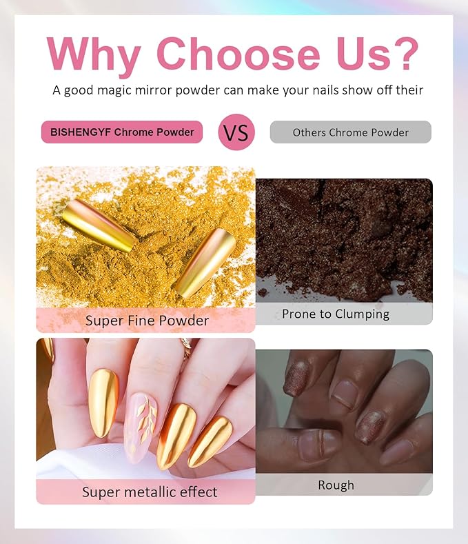 - Beginners Chrome Nail Powder Kit: You will get a can of gold chrome nail powder、 fairy effect pink chrome nail powder、 white pearl chrome nail powder and silver chrome powder. BISHENGYF mirror chrome nail powder enables beginners to make any nail art style you want at home.