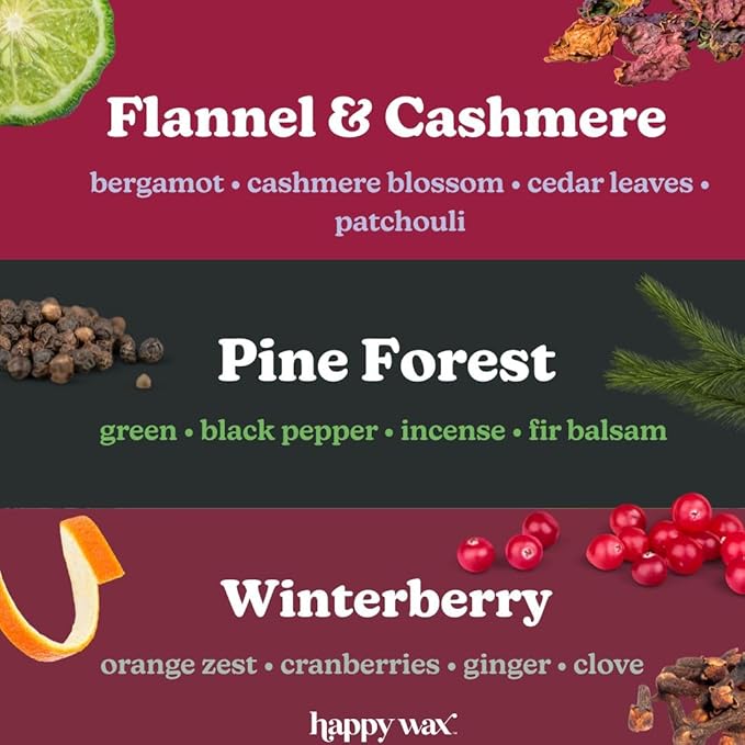 Happy Wax Winter Outdoors Mix Scented Natural, Non Toxic Soy Wax Melts; 6 Total Oz. of Holiday Scented Wax Melts, Collection Includes Winterberry, Evergreen Trees and Peppermint Bark