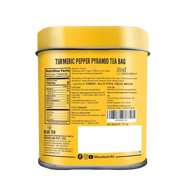 BLUE TEA - Turmeric Tea - Pepper - 30 Count - Pyramid Plant Based Tea Bag | CURCUMIN RICH - HERBAL BLEND | Herbal Tea - Caffeine Free - No Sugar - Earthy Flavor - Healthy | Tin Pack (Pack of 2)