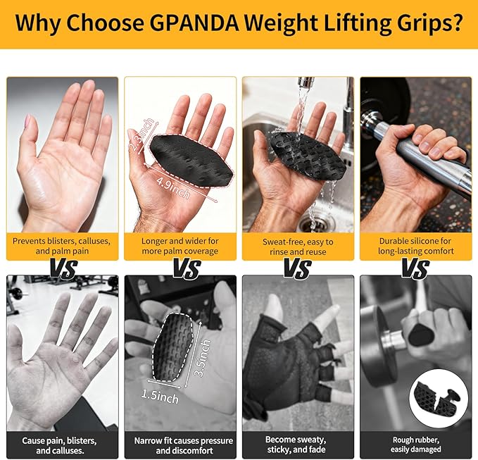 - UNLEASH YOUR STRENGTH - GPANDAG's 1 pair weight lifting hooks and 1 pair premium workout grips team up to evenly distribute pressure, prevent palm pain, and stop calluses. Secure and comfortable for all hand shapes