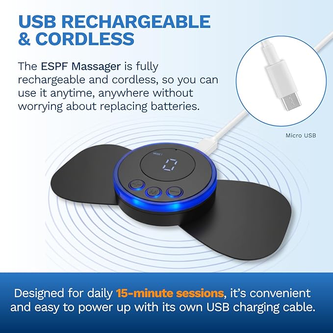 - Wireless, Compact & Easy to Wear. The cordless design allows you to move freely while using it. Lightweight and discreet, the ESPF Massager attaches to a reusable sticky pad and fits comfortably under clothing.