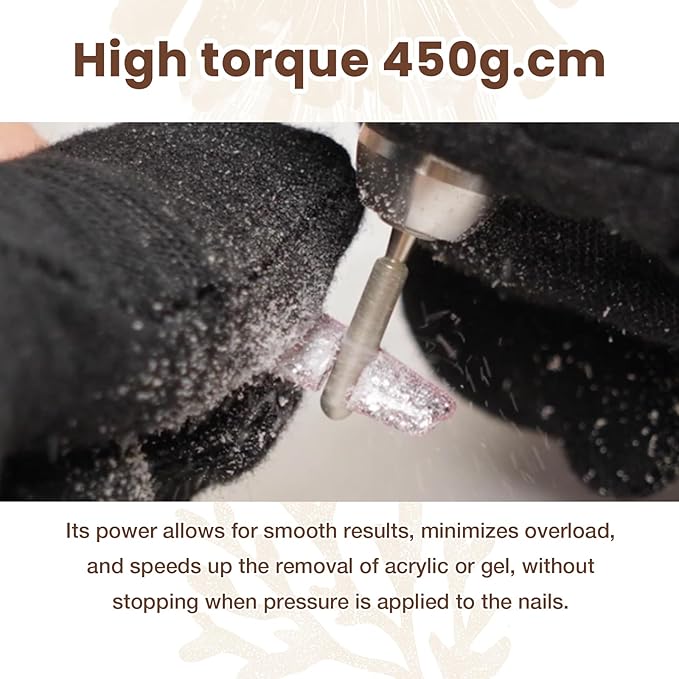- Exclusive High-Torque Motor: The industry-leading 0.46 kgf.cm (4.5 n.cm) high torque motor enables the Delanie e-file nail drill to smoothly file off any nail products and shape any artificial nails without stopping on nails. 0.34 kgf.cm measured on the nail drill bit