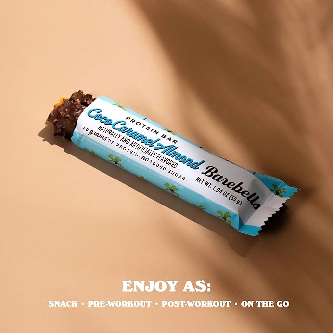 - BAREBELLS COCONUT CARAMEL ALMOND BAR - 12 individual yummy Barebells protein bars! Barebells Coconut Caramel Almond features a soft, coconut caramel almond-flavored inner coated in milk chocolate.