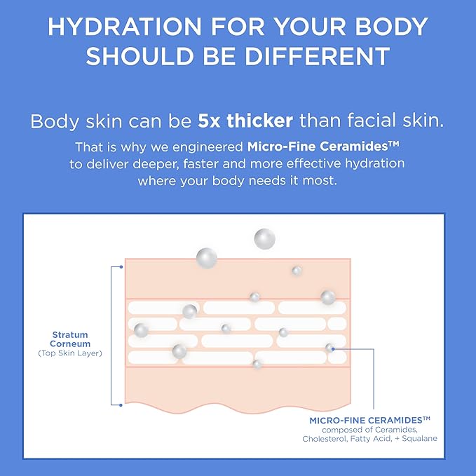 - MICRO-FINE CERAMIDESTM CAPSULES: Mixture of Ceramides/cholesterol/fatty acds and squalane engineered for thicker layers of body skin that helps effectively deliver moisturization & strengthens skin barrier.