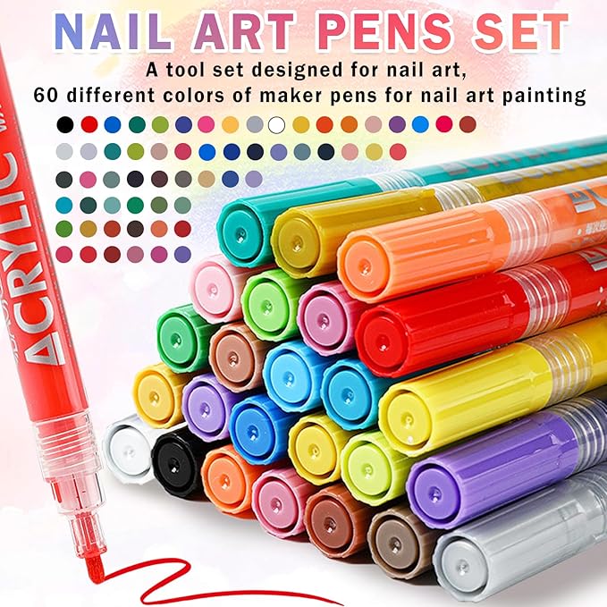 - NAIL ART PENS SET: A tool set designed for nail art, 60 different colors of maker pens for nail art painting, used to draw various patterns, lines, dots, etc. on nails to achieve unique nail art effects
