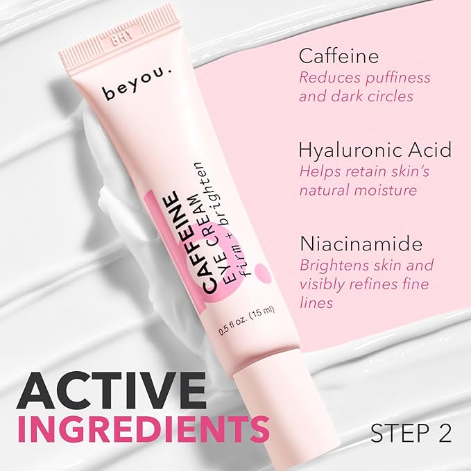 - ENERGIZE & BRIGHTEN - STEP 2: Revive tired eyes with this fast-absorbing Caffeine Eye Cream, infused with Caffeine and Hyaluronic Acid to brighten dark circles, firm, and deeply hydrate. A must-have for post-holiday late nights — suitable for all skin tones and types.