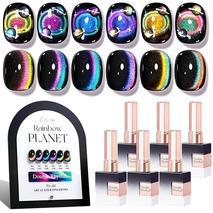 Double Rhythm Cat Eye Gel Nail Polish Set of 6 Same Color Same Bottle 0.5 Oz Shimmer Glitter with Magnet Holographic Reflective Magnetic UV Nail Polish Kit at Home (Holographic Rainbow-T6-88)