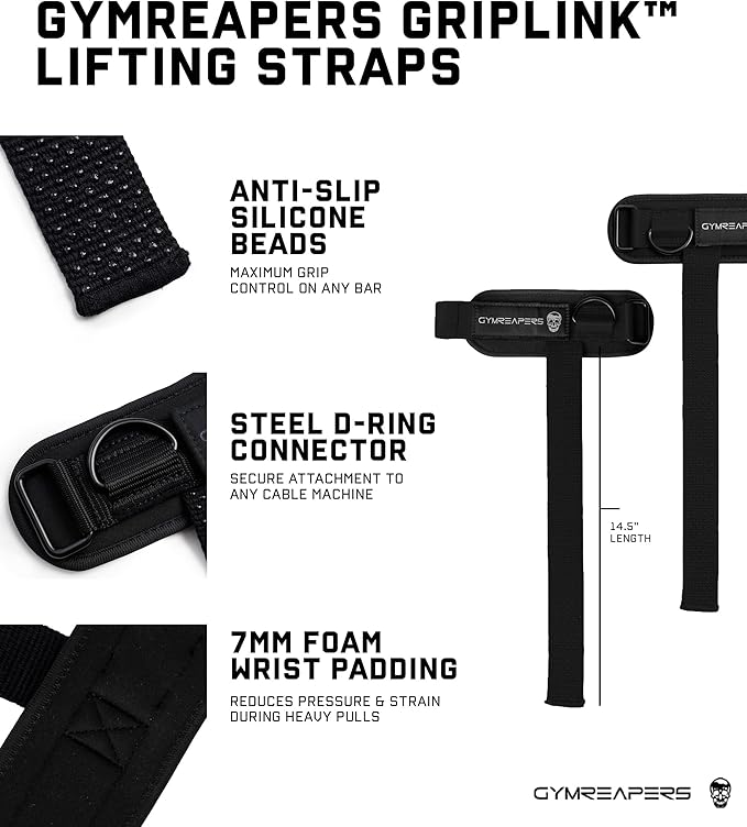 - GYMREAPERS GRIPLINK LIFTING STRAPS – We built the Gymreapers Griplink Wrist Straps for lifters who refuse to let grip fatigue limit their performance. When the weight gets heavy and focus matters most, you need gear that supports your strength without getting in the way. These straps were made to give you total control by locking you into every cable movement, row, pull and deadlift with ease. The goal is to help you lift more, train harder, and push past the point where your grip gives out so you can focus on building real strength and results.
