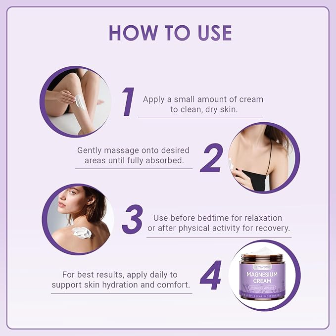 - Bedtime Wind-Down Ritual — Apply this nighttime magnesium lotion before bed to create a calming routine. Ideal for legs and feet after long days, helping your body feel at ease while you relax and unwind under pajamas or sheets.